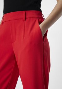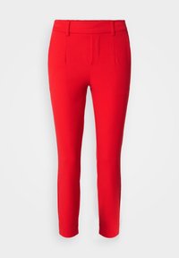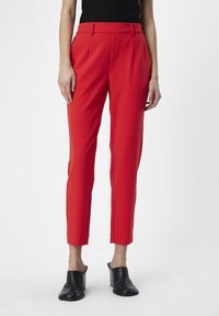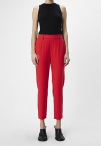 Pantalon rouge sur mesure à coupe ajustée, composé d'un tissu lisse. Dispose de deux poches avant et d'un design à plis plats, se terminant au-dessus de la cheville.
