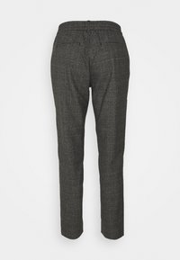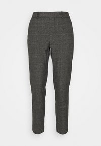 Pantalons à carreaux gris en tissu texturé, avec une coupe slim et une jambe fuselée, présentant des motifs de carreaux subtils tout au long.