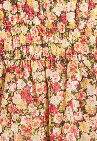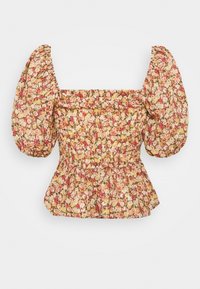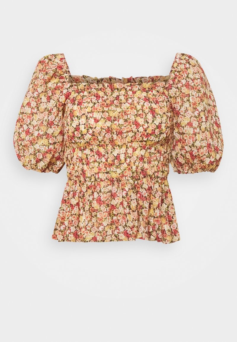 Blouse florale avec des manches bouffantes, un corsage élastique et un ourlet peplum. Elle présente un tissu léger et texturé avec un mélange de fleurs roses, jaunes et vertes.
