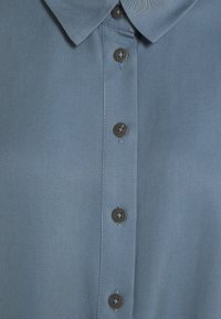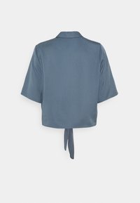 Chemise à manches courtes bleu acier avec col, boutons et nœud à l'avant, présentée sur un fond blanc.