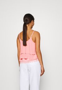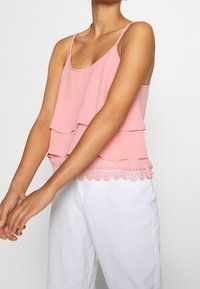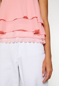 Camisole rose à plusieurs couches avec bretelles réglables, présentant un ourlet en dentelle festonné. Associée à un pantalon blanc ample.