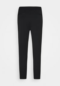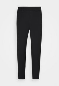 Pantalon noir à coupe slim, confectionné dans un tissu lisse ; doté d'un devant plat, de passants pour ceinture et de deux poches latérales.
