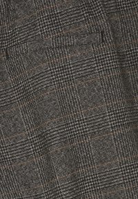 Pantalon fuselé à carreaux marron et gris avec passants de ceinture et devant plat, présenté sur un fond blanc.