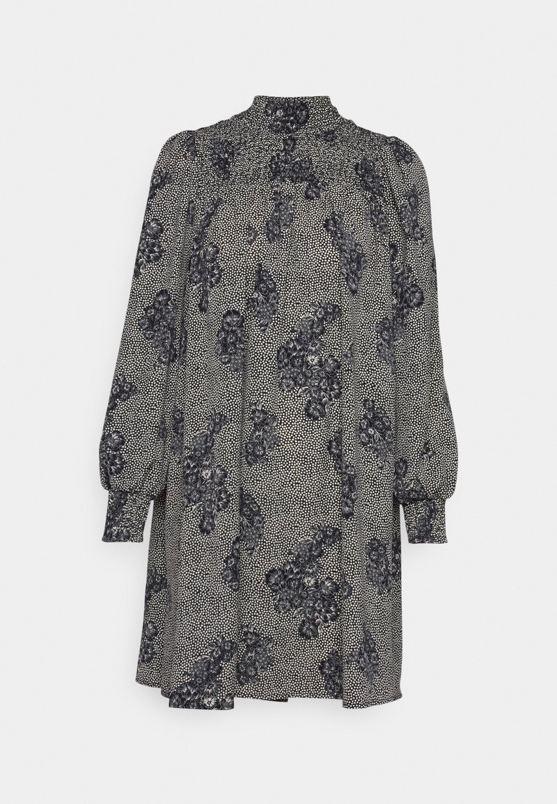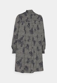 Robe à manches longues avec un col montant, présentant un motif floral noir et blanc sur un fond texturé. Coupe ample et manches froncées.