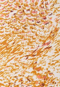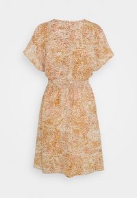 Robe à manches courtes et col en V en tissu doux avec un motif abstrait orange et blanc, taille cintrée et jupe fluide. Fermeture éclair au dos.