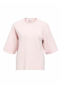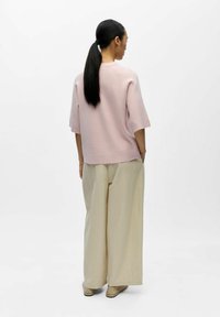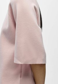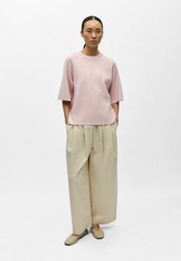 Femme aux cheveux bruns attachés portant un pull léger rose à manches courtes et un pantalon beige, debout avec un bras croisé sur l'autre.