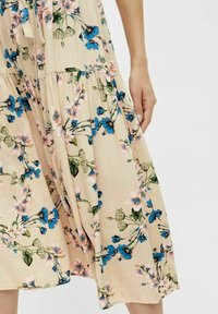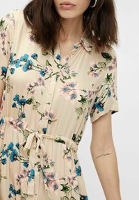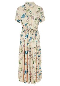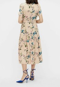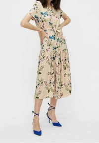 Robe midi fleurie à manches courtes, avec un fond beige, des motifs floraux bleus et roses, et une taille ceinturée. Associée à des talons bleus.