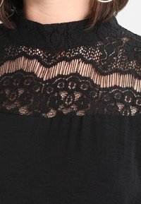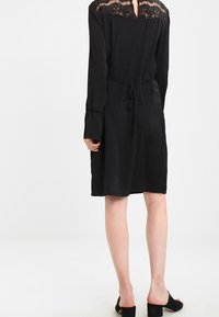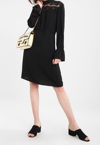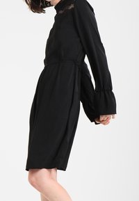 Robe noire avec des manches longues en forme de cloche, avec un col texturé. Fabriquée dans un matériau léger, longueur genou, coupe ample.