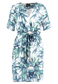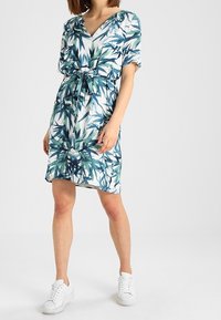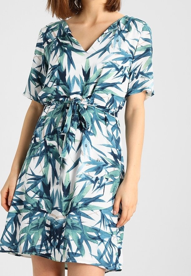 Femme portant une robe à manches courtes, longueur genou, ornée de motifs de feuilles vertes et bleues, avec une ceinture en tissu nouée à la taille.