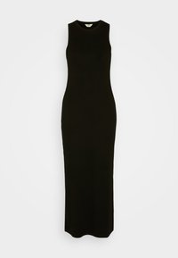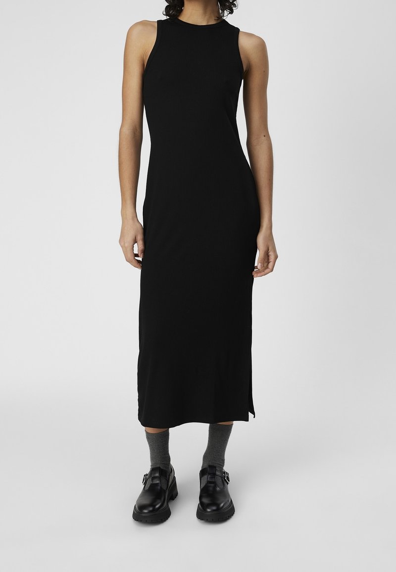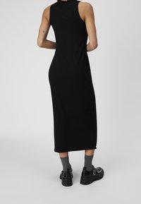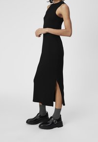 Femme portant une robe midi noire sans manches, des chaussettes grises et des chaussures noires à boucle, debout devant un fond clair uni.