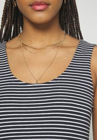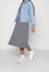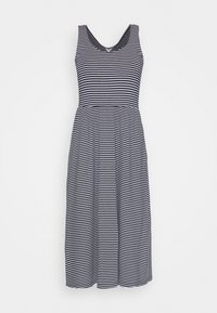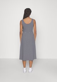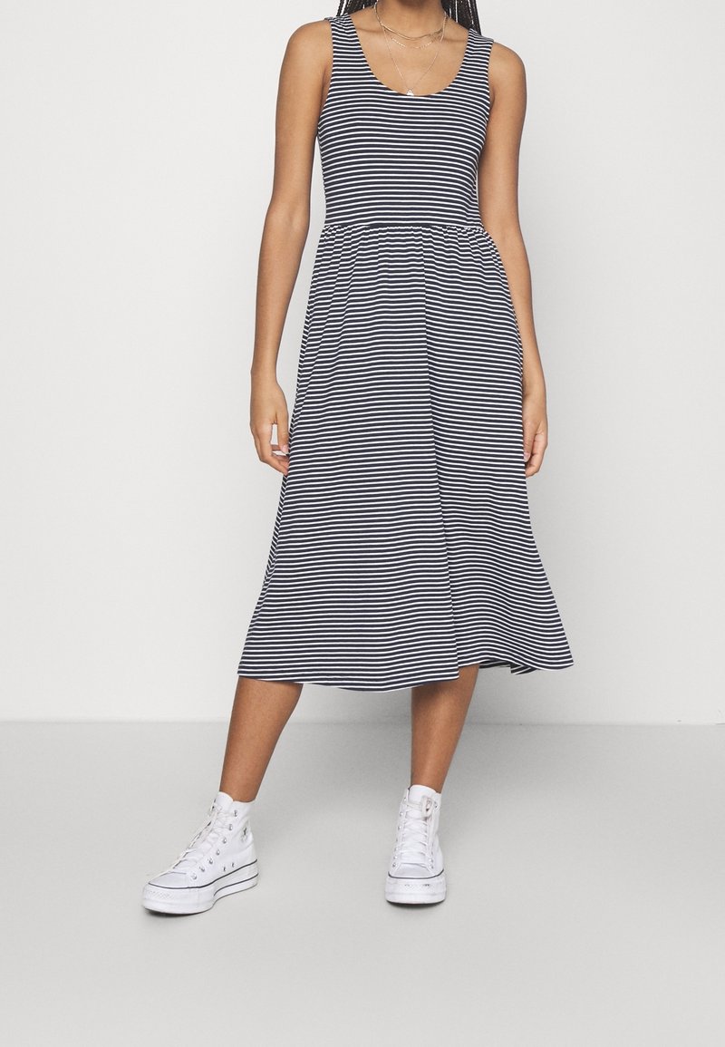 Robe sans manches rayée bleu marine et blanc, avec un corsage ajusté et une jupe évasée. Associée à des baskets blanches montantes.