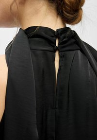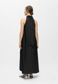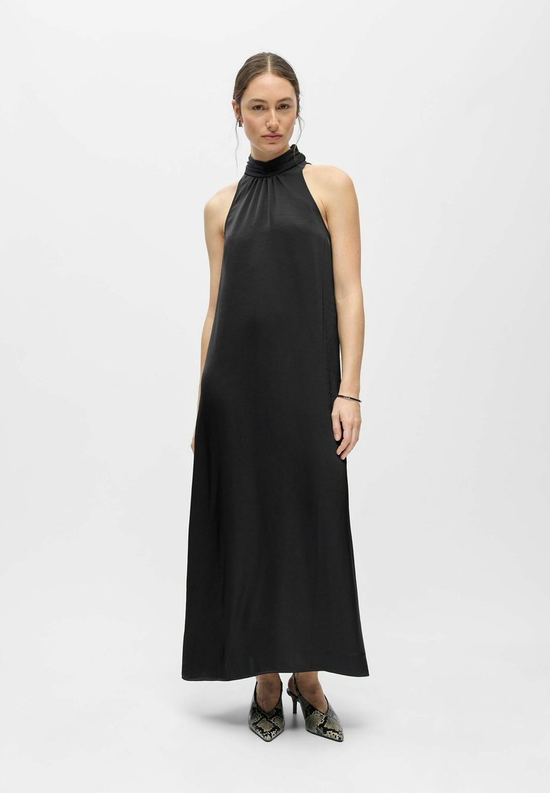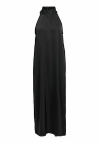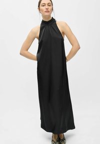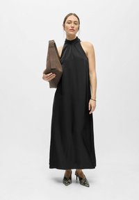 Femme portant une robe maxi noire sans manches à col halter avec des talons hauts à motifs noir et blanc, debout devant un fond blanc uni.