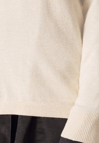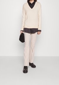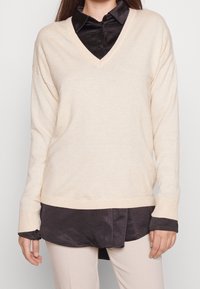 Femme portant un pull beige à col en V superposé sur une chemise noire boutonnée, avec un pantalon beige, debout devant un fond clair uni.