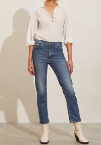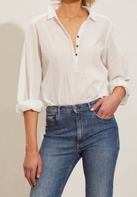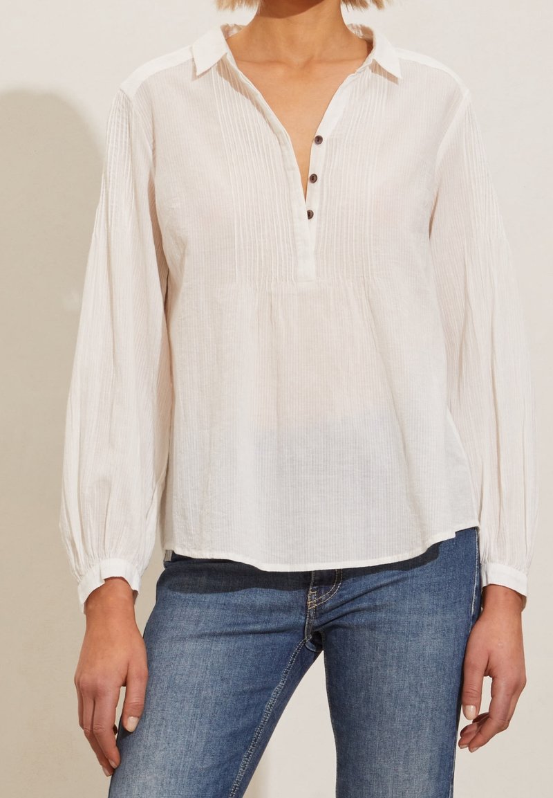 Blouse blanche à manches longues avec patte boutonnée, plis devant et texture côtelée. Associée à un jean bleu, elle offre une coupe décontractée.