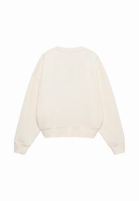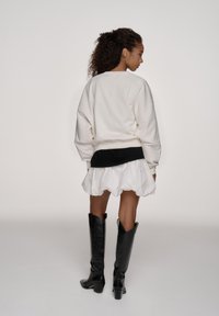 Femme aux cheveux bouclés portant un sweat-shirt blanc avec l'inscription "GIRL'S GIRL", un chemisier noir en dessous et une jupe blanche, posant devant un fond uni.