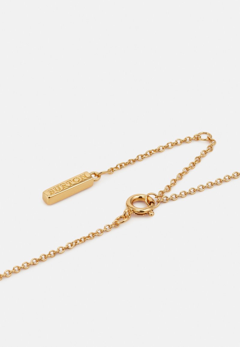 Chaîne en or avec une petite plaque rectangulaire gravée "BURTON" et un fermoir anneau ressort sur fond blanc.