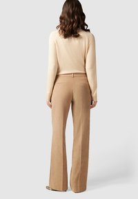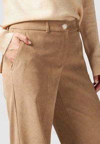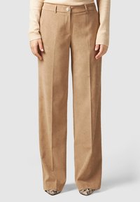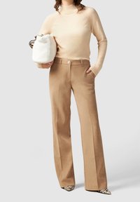 Pantalon beige taille haute en tissu doux, avec une coupe droite à jambe large, des plis à l'avant et un bouton décoratif à la taille.