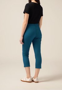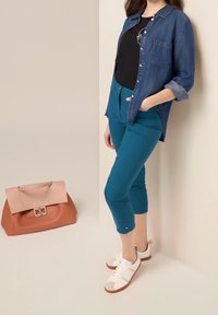 Pantalon court bleu sarcelle avec une coupe slim, doté de poches avant et d'une texture lisse, associé à des baskets blanches sur un fond neutre.