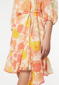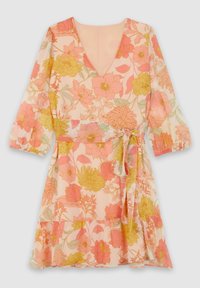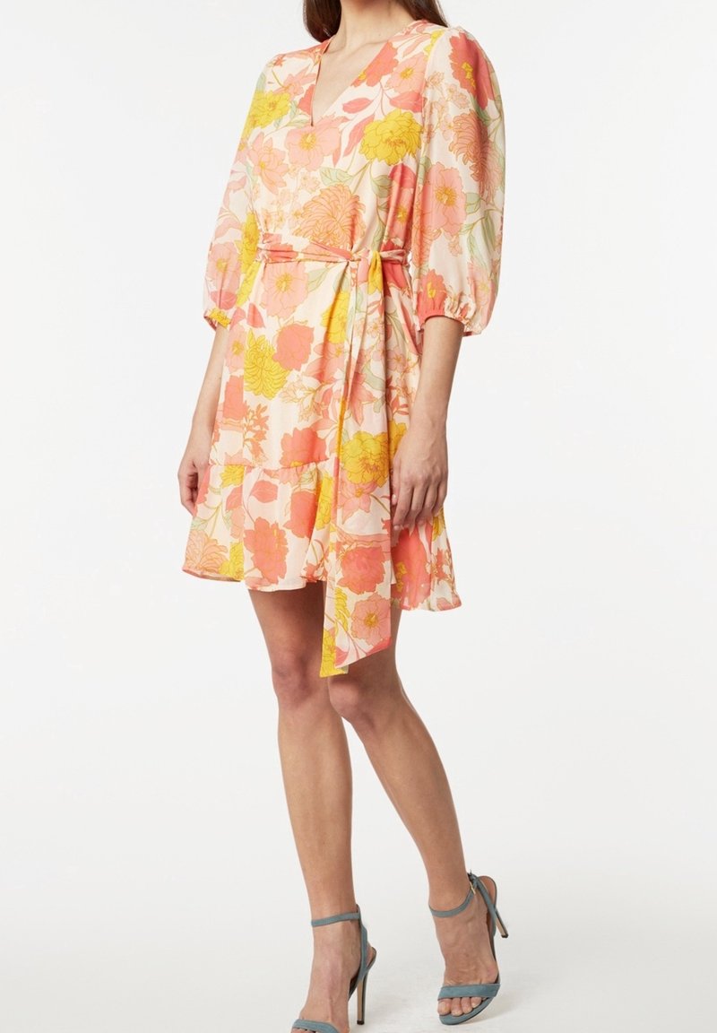 Robe florale dans des tons de rose et de jaune, avec un col en V, des manches bouffantes, une taille cintrée avec un lien, et un ourlet inférieur à plusieurs niveaux.