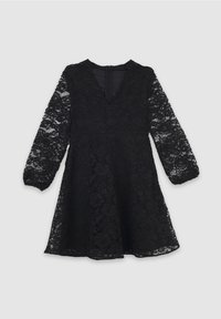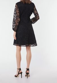 Robe en dentelle noire avec de longues manches transparentes, décolleté en V et ourlet à volants. Associée à des talons noirs à lanières.