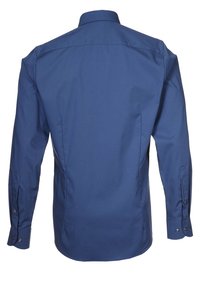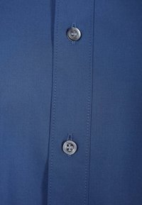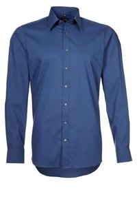 Chemise habillée pour homme à manches longues, bleue, boutonnée, avec col pointu et poignets boutonnés, présentée sur un fond blanc.