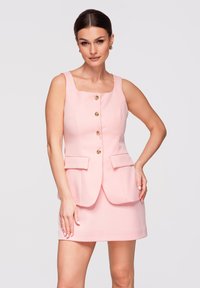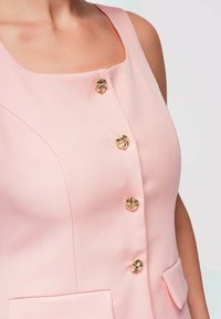 Femme portant une robe rose sans manches avec des boutons dorés et des poches à rabat sur le devant, regardant sur le côté sur un fond uni.