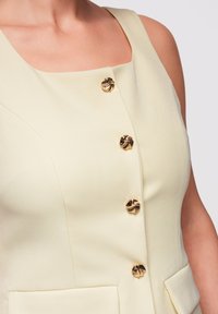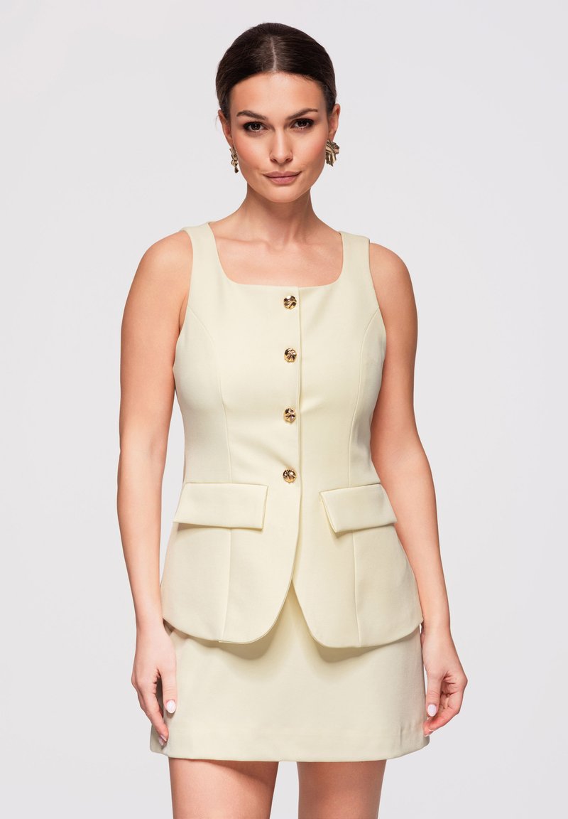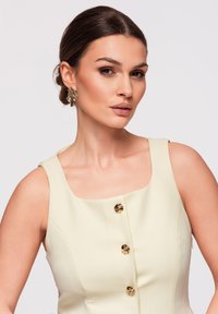 Femme aux cheveux foncés portant une robe crème sans manches avec des boutons dorés et des poches à rabat à l'avant, debout devant un fond clair uni.