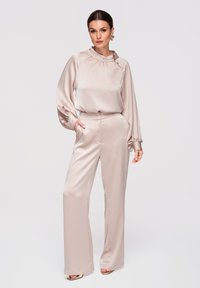 Femme portant un chemisier en satin beige à manches bouffantes et un pantalon taille haute assorti, posant devant un fond uni.