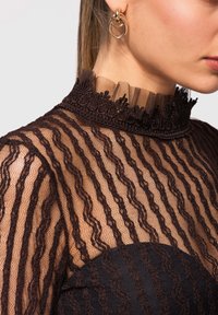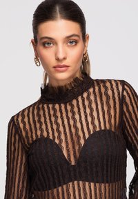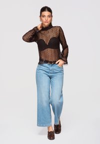 Femme aux cheveux tirés en arrière, portant un haut en dentelle noire transparente sur un soutien-gorge noir et un jean bleu, posant avec une main près du visage et l'autre dans la poche.