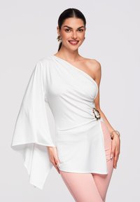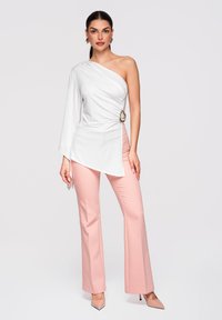 Femme portant un haut asymétrique blanc avec une boucle dorée et un pantalon rose, posant avec une main sur la hanche sur un fond uni.