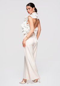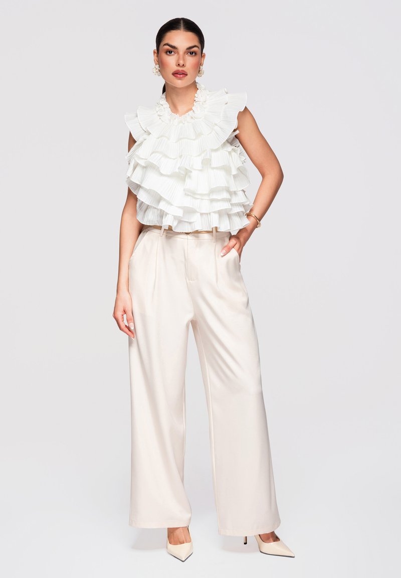 Femme portant un top blanc à volants superposés sans manches, un pantalon crème à jambes larges et des talons pointus, debout avec une main dans la poche.