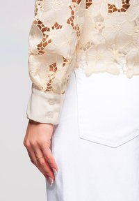 Femme aux cheveux foncés portant une chemise boutonnée en dentelle florale beige transparente et un pantalon blanc, debout les mains dans les poches devant un fond uni.