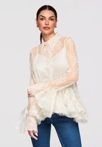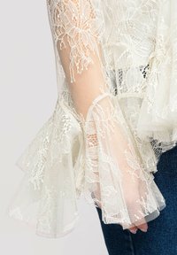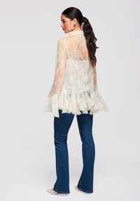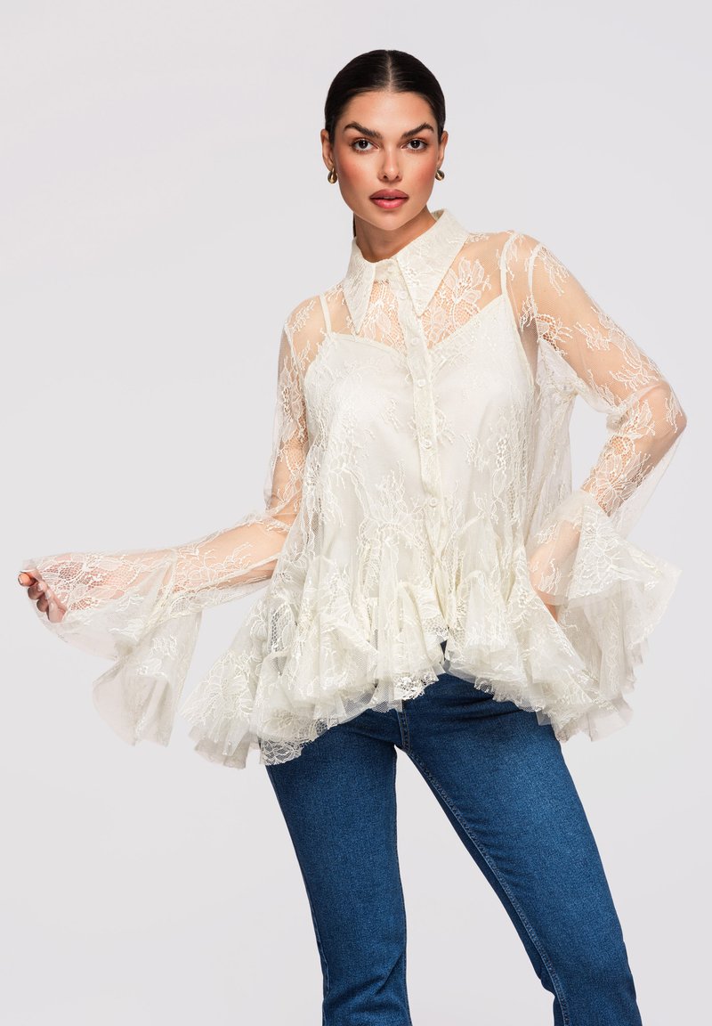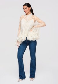 Femme portant un chemisier en dentelle blanche transparente avec ourlet à volants et manches évasées, associé à un jean bleu, posant devant un fond uni.