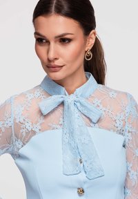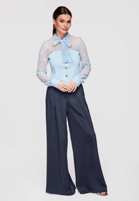 Femme portant un chemisier en dentelle bleu clair transparent avec col à nœud papillon et corsage uni, associé à un pantalon foncé taille haute, fond neutre.