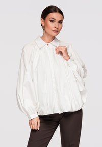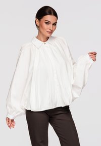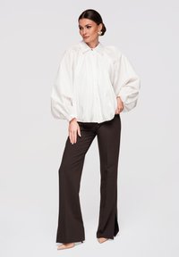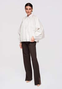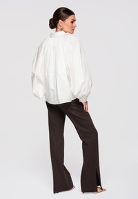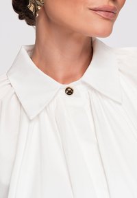 Femme portant un chemisier blanc ample à manches longues avec un bouton doré au col, associé à un pantalon foncé ajusté, posant devant un fond uni.