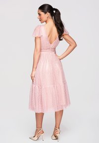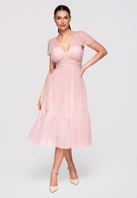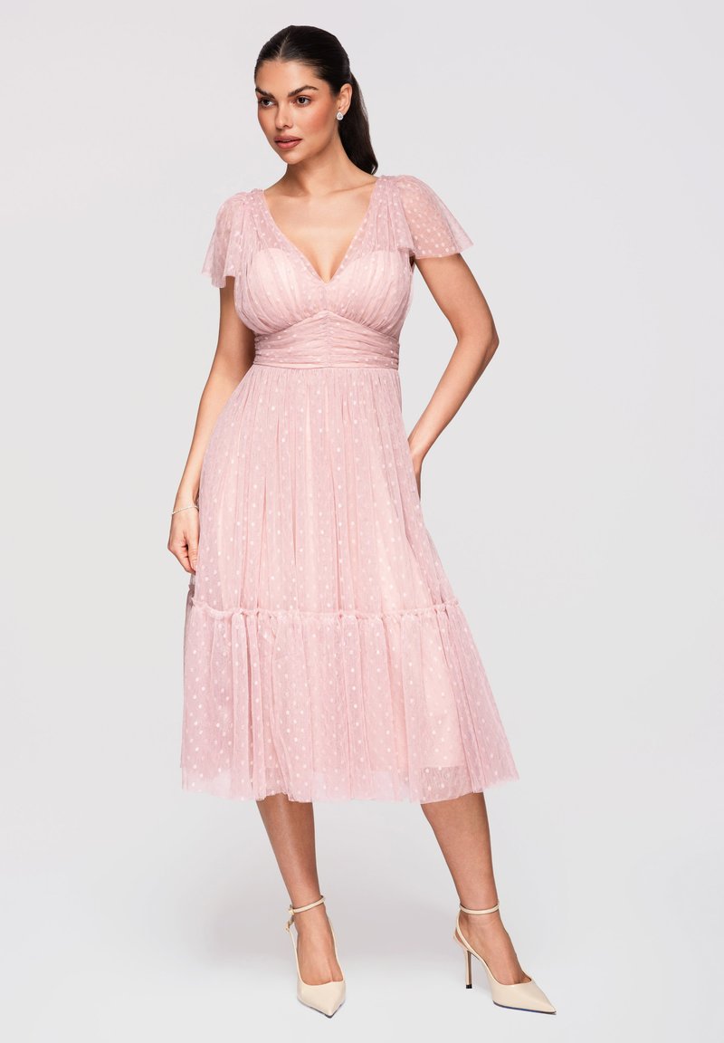 Femme portant une robe midi rose pâle à pois avec des manches volantées et des chaussures crème à talons hauts avec brides à la cheville, debout avec une main sur la hanche.