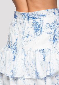 Femme portant une jupe à volants blanche et bleue à motif floral avec un chemisier assorti et des escarpins en daim bleu clair avec des nœuds à la cheville.