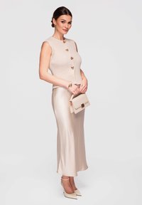 Femme aux cheveux foncés portant des boucles d'oreilles créoles dorées, un haut en tricot beige sans manches avec des boutons en forme de cœur, et une jupe beige clair.