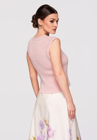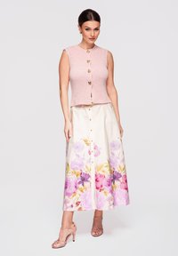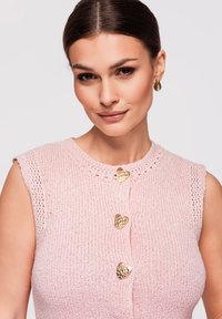 Femme portant un haut en tricot rose sans manches avec des boutons dorés en forme de cœur et une jupe crème avec une ceinture et des boutons dorés sur un fond clair.