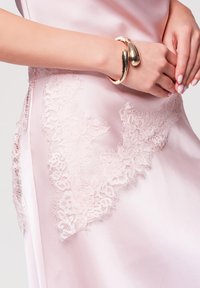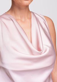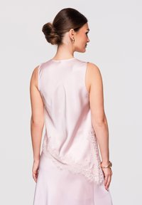 Femme portant une robe sans manches en satin rose pâle avec bordure en dentelle et ourlet asymétrique, associée à des chaussures à talons hauts sombres à bout pointu, debout.