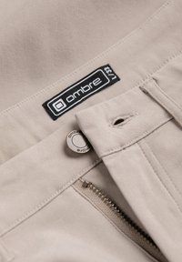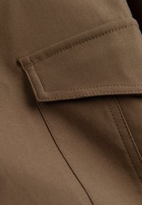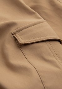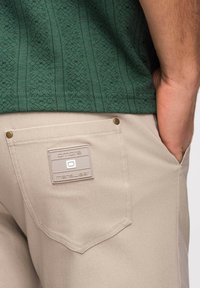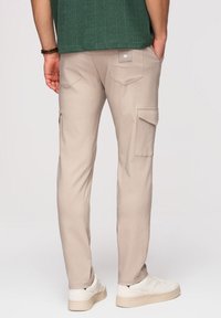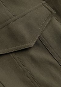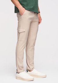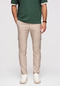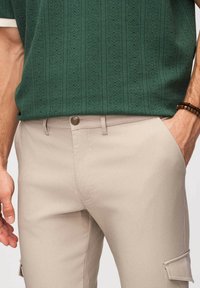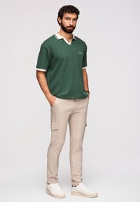 Homme portant un pantalon cargo beige, des baskets blanches et un pull en tricot vert foncé à manches courtes, les mains détendues le long du corps.