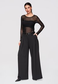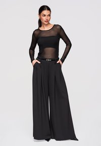 Femme portant un pantalon noir à jambes larges avec plis, une fine ceinture noire, un top transparent à manches longues, les mains dans les poches, et des chaussures noires à bouts pointus.