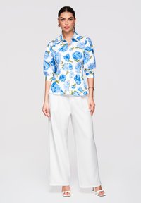 Femme portant un pantalon blanc large taille haute, une chemise boutonnée bleue à fleurs, des sandales blanches à talons, et un bracelet en or au poignet gauche.