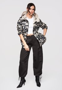 Femme portant une veste beige avec une doublure à capuche imprimée léopard, des poches zippées noires, et un pantalon noir, posant avec une main dans la poche.