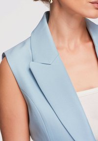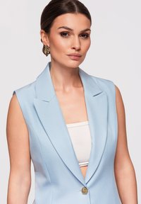 Femme portant une robe blazer sans manches bleu clair avec jupe plissée, un crop top blanc et des boucles d'oreilles dorées, posant devant un fond uni.