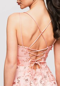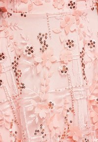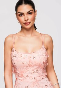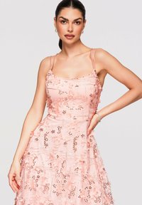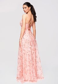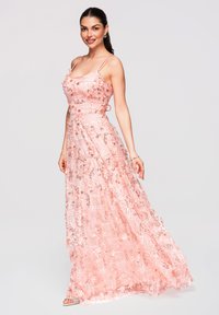 Femme en robe rose sans manches, longue jusqu'au sol, avec des broderies florales, souriante et posant avec une main près de son cou.