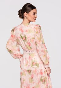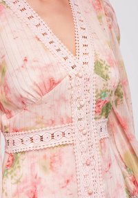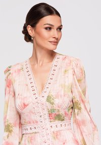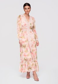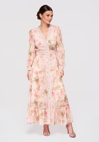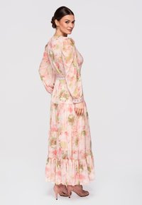 Femme portant une longue robe fleurie rose pastel avec bordure en dentelle, manches bouffantes et ourlet à volants superposés, portée avec des talons ouverts, se tenant devant un fond uni.