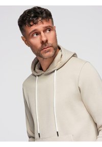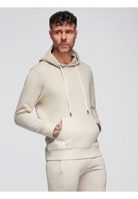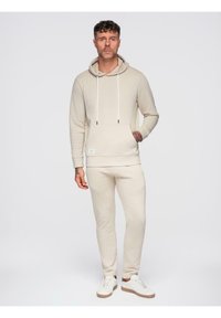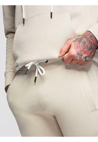 Homme aux cheveux courts et bouclés, tatoué, portant un sweat à capuche beige et un pantalon de survêtement assorti, debout avec une main dans la poche et des baskets blanches.