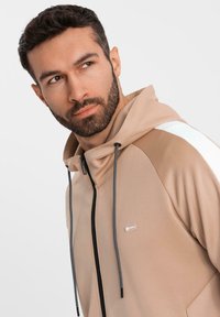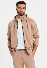 Homme marchant vêtu d'un sweat à capuche beige zippé et d'un pantalon de jogging assorti, t-shirt en maille blanc et baskets blanches sur un fond blanc uni.