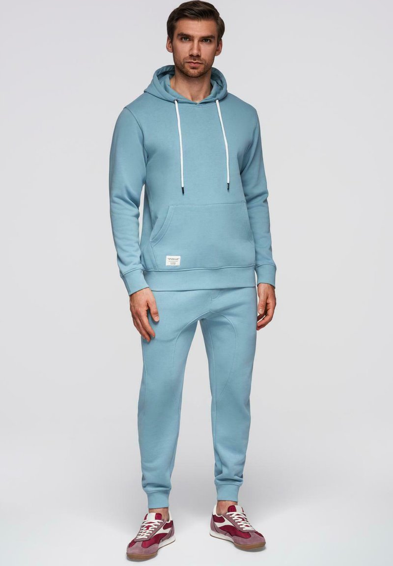 Homme debout portant un sweat à capuche bleu clair et un jogging assorti avec des cordons blancs, ainsi que des baskets rouges et blanches, sur fond uni.